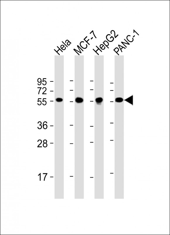 All lanes : Anti-PDIA1 Antibody at 1:4000 dilution Lane 1: Hela whole cell lysate Lane 2: MCF-7 whole cell lysate Lane 3: HepG2 whole cell lysate Lane 4: PANC-1 whole cell lysate Lysates/proteins at 20 μg per lane. Secondary Goat Anti-mouse IgG, (H+L), Peroxidase conjugated at 1/10000 dilution. Predicted band size : 57 kDa Blocking/Dilution buffer: 5% NFDM/TBST. |