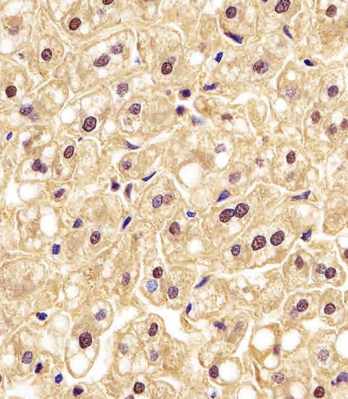 APR09086G staining PGK1 in human liver tissue sections by Immunohistochemistry (IHC-P - paraformaldehyde-fixed, paraffin-embedded sections). Tissue was fixed with formaldehyde and blocked with 3% BSA for 0. 5 hour at room temperature; antigen retrieval was by heat mediation with a citrate buffer (pH6). Samples were incubated with primary antibody (1/25) for 1 hours at 37°C. A undiluted biotinylated goat polyvalent antibody was used as the secondary antibody.