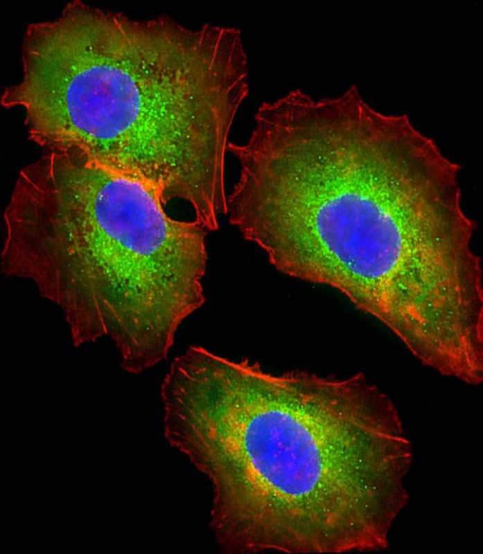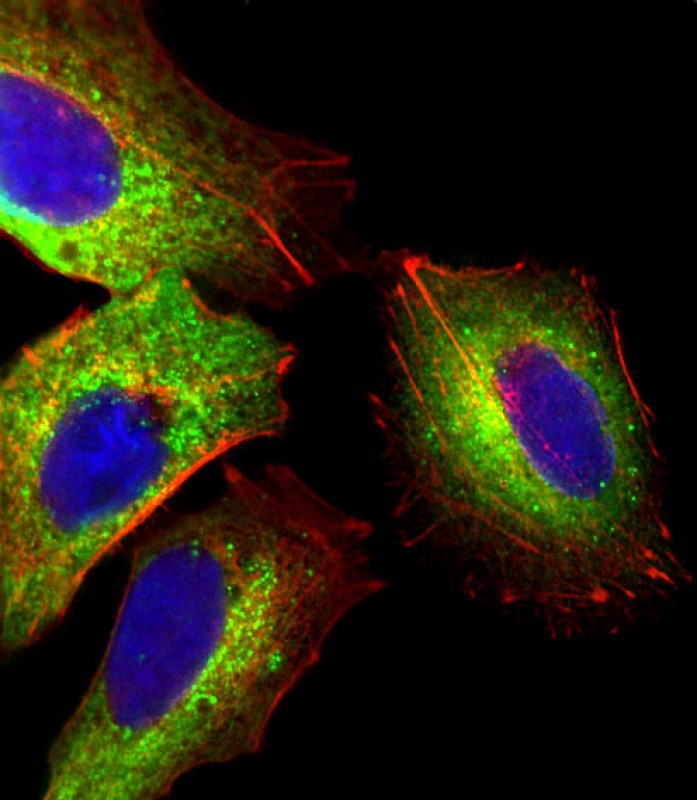Immunofluorescent analysis of 4% paraformaldehyde-fixed, 0. 1% Triton X-100 permeabilized HepG2 (human liver hepatocellular carcinoma cell line) cells labeling Pdx1 with APG01623G at 1/25 dilution, followed by Dylight? 488-conjugated goat anti-rabbit IgG (NK179883) secondary antibody at 1/200 dilution (green). Immunofluorescence image showing cytoplasm staining on HepG2 cell line. Cytoplasmic actin is detected with Dylight? 554 Phalloidin (PD18466410) at 1/100 dilution (red). The nuclear counter stain is DAPI (blue). |