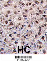 Formalin-fixed and paraffin-embedded human hepatocarcinoma tissue reacted with PEMT antibody (N-term) (Cat. APR09036G), which was peroxidase-conjugated to the secondary antibody, followed by DAB staining. This data demonstrates the use of this antibody for immunohistochemistry; clinical relevance has not been evaluated. |