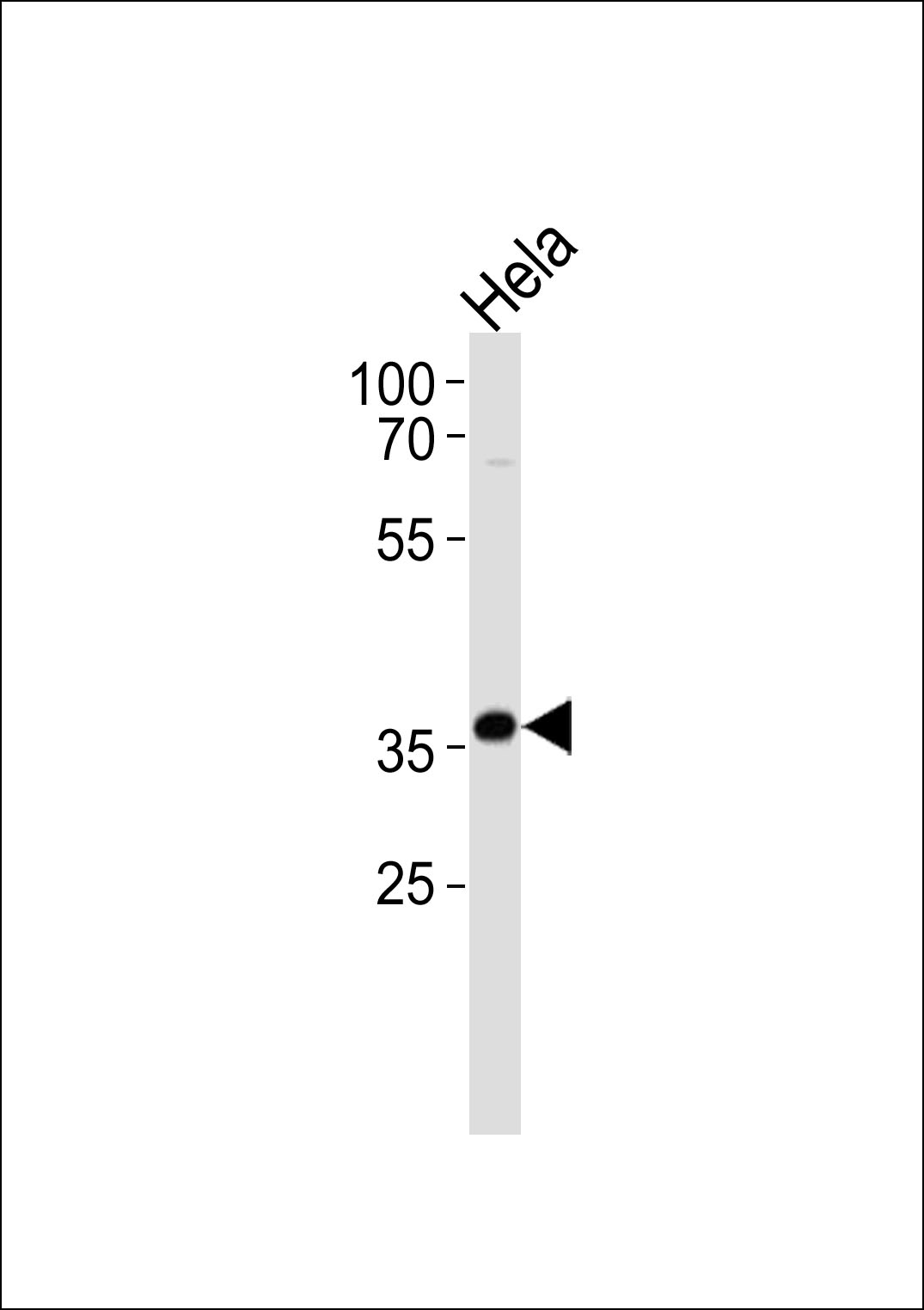 AKR1C3 Antibody (Center) (Cat. APG01663G) western blot analysis in Hela cell line lysates (35ug/lane).This demonstrates the AKR1C3 antibody detected the AKR1C3 protein (arrow).