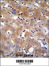 TRPM8 Antibody (Center) (Cat. APR10555G)immunohistochemistry analysis in formalin fixed and paraffin embedded human liver tissue followed by peroxidase conjugation of the secondary antibody and DAB staining.This data demonstrates the use of TRPM8 Antibody (Center) for immunohistochemistry. Clinical relevance has not been evaluated.