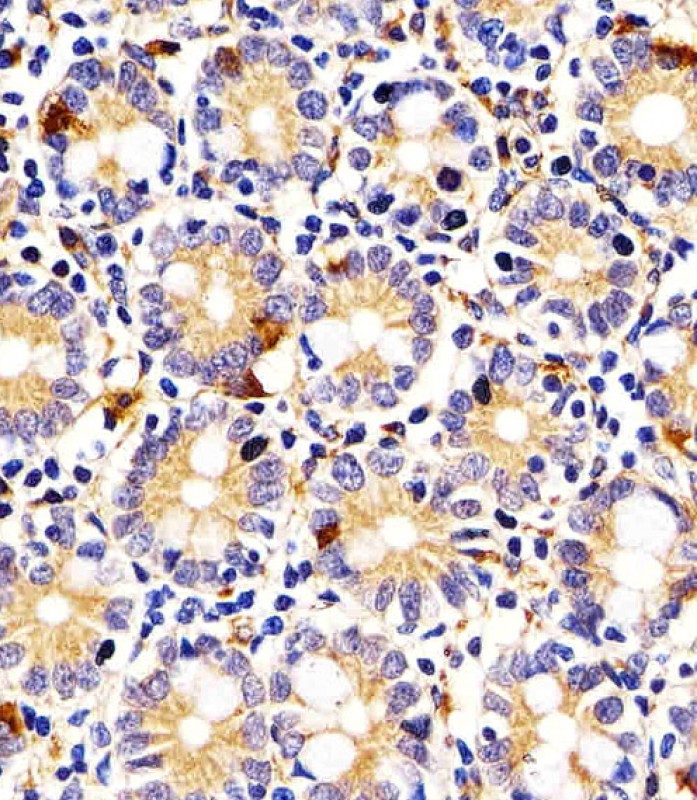 APR07910G staining I23O2 in Human small intestine tissue sections by Immunohistochemistry (IHC-P - paraformaldehyde-fixed, paraffin-embedded sections). Tissue was fixed with formaldehyde and blocked with 3% BSA for 0. 5 hour at room temperature; antigen retrieval was by heat mediation with a citrate buffer (pH6). Samples were incubated with primary antibody (1/25) for 1 hours at 37°C. A undiluted biotinylated goat polyvalent antibody was used as the secondary antibody.