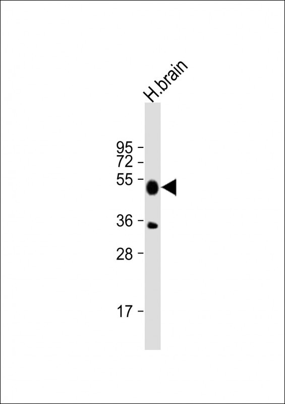Anti-I23O2 Antibody (C-term) at 1:4000 dilution + human brain lysate Lysates/proteins at 20 μg per lane. Secondary Goat Anti-Rabbit IgG, (H+L), Peroxidase conjugated at 1/10000 dilution. Predicted band size : 45 kDa Blocking/Dilution buffer: 5% NFDM/TBST.