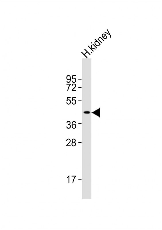 Anti-I23O2 Antibody (C-term)at 1:2000 dilution + human kidney lysates Lysates/proteins at 20 μg per lane. Secondary Goat Anti-Rabbit IgG, (H+L), Peroxidase conjugated at 1/10000 dilution Predicted band size : 45 kDa Blocking/Dilution buffer: 5% NFDM/TBST. |