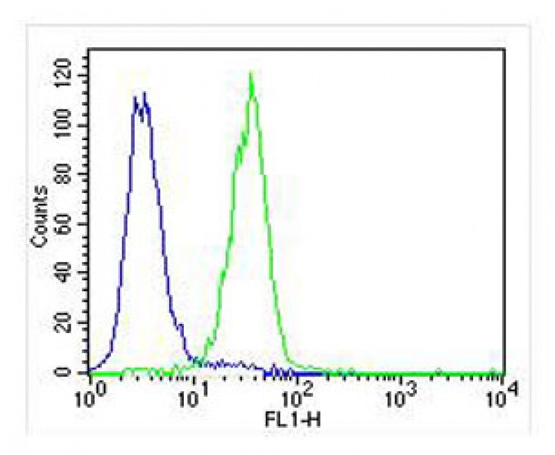 Overlay histogram showing U-87 MG cells stained with APR14299G (green line). The cells were fixed with 2% paraformaldehyde (10 min) and then permeabilized with 90% methanol for 10 min. The cells were then icubated in 2% bovine serum albumin to block non-specific protein-protein interactions followed by the antibody (APR14299G, 1:25 dilution) for 60 min at 37?C. The secondary antibody used was Goat-Anti-Rabbit IgG, DyLight? 488 Conjugated Highly Cross-Adsorbed(NA168821)) at 1/400 dilution for 40 min at 37?C. Isotype control antibody (blue line) was mouse IgG1 (1μg/1x10^6 cells) used under the same conditions. Acquisition of >10, 000 events was performed.