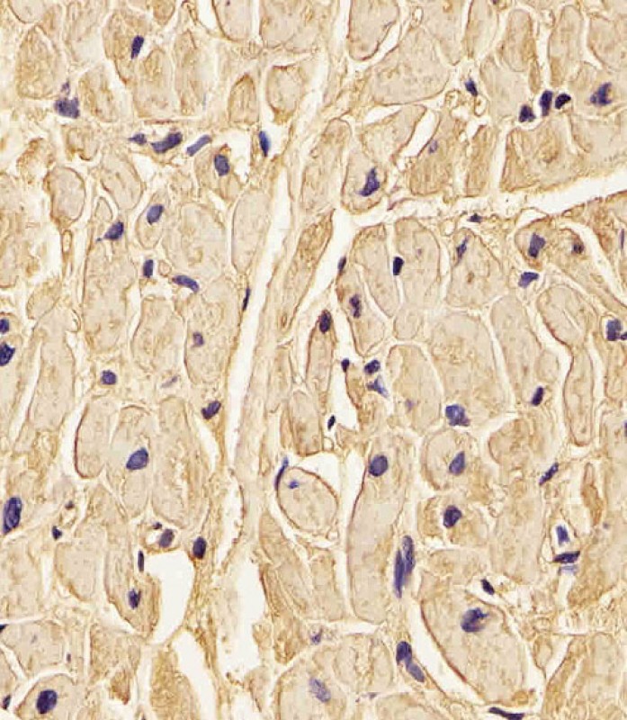 APR14299G staining PLOD1 in Human heart tissue sections by Immunohistochemistry (IHC-P - paraformaldehyde-fixed, paraffin-embedded sections). Tissue was fixed with formaldehyde and blocked with 3% BSA for 0. 5 hour at room temperature; antigen retrieval was by heat mediation with a citrate buffer (pH6). Samples were incubated with primary antibody (1/25) for 1 hours at 37°C. A undiluted biotinylated goat polyvalent antibody was used as the secondary antibody. |
