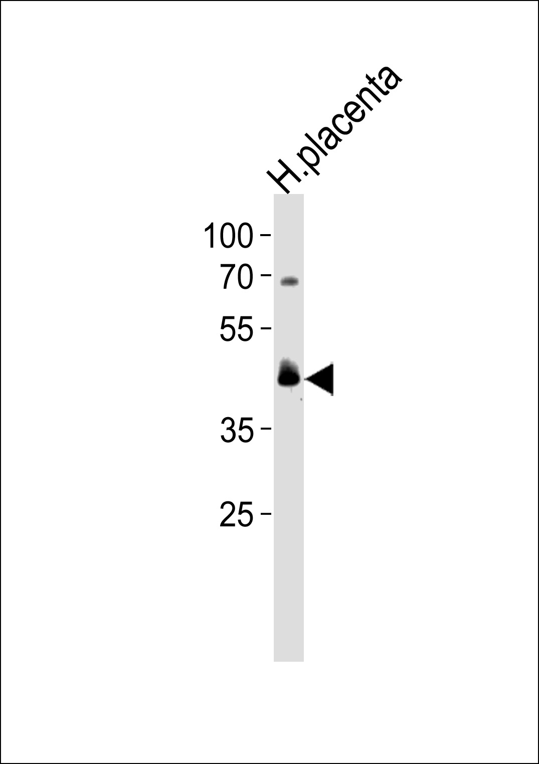 PPARD Antibody (C-term) (Cat. AMR09457G) western blot analysis in human placenta tissue lysates (35ug/lane).This demonstrates the PPARD antibody detected the PPARD protein (arrow). |