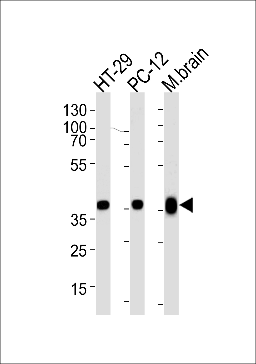 Western blot analysis of lysates from HT-29, PC-12 cell line and mouse brain tissue lysate (from left to right), using PPP1CB Antibody (C-term) ( AMR09473G). AMR09473G was diluted at 1:1000 at each lane. A goat anti-rabbit IgG H&L(HRP) at 1:5000 dilution was used as the secondary antibody. Lysate at 35ug per lane. |