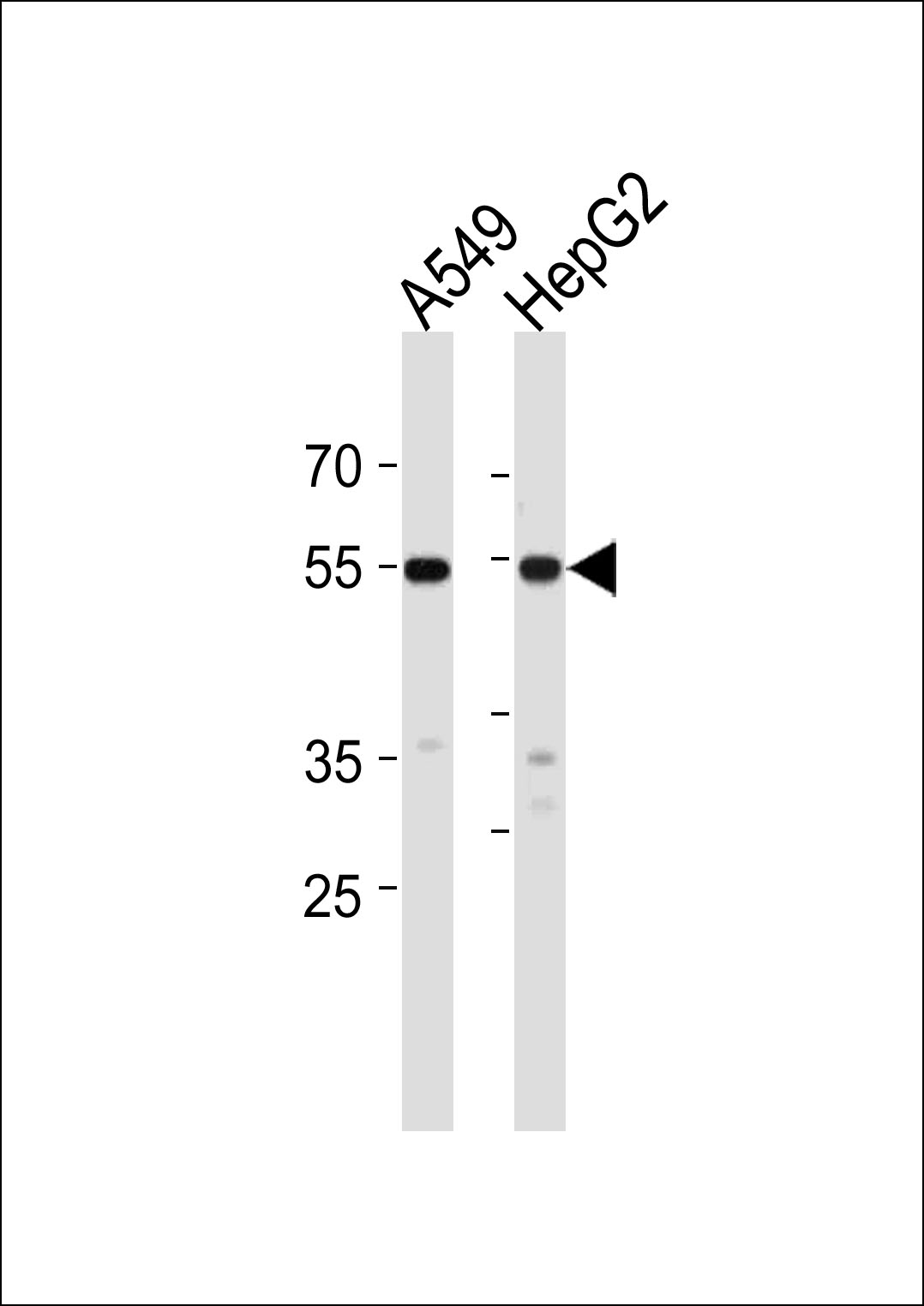 ALDH2 Antibody (Cat. APG01746G) western blot analysis in A549,HepG2 cell line lysates (35ug/lane).This demonstrates the ALDH2 antibody detected the ALDH2 protein (arrow).