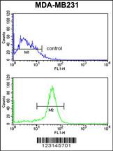 ALDH2 Antibody (Cat. APG01746G) flow cytometry analysis of MDA-MB231 cells (bottom histogram) compared to a negative control cell (top histogram).FITC-conjugated goat-anti-rabbit secondary antibodies were used for the analysis. |