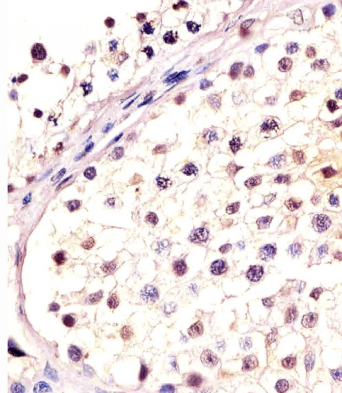 AMM06955G staining DPPA4 in human testis tissue sections by Immunohistochemistry (IHC-P - paraformaldehyde-fixed, paraffin-embedded sections). Tissue was fixed with formaldehyde and blocked with 3% BSA for 0. 5 hour at room temperature; antigen retrieval was by heat mediation with a citrate buffer (pH6). Samples were incubated with primary antibody (1/25) for 1 hours at 37°C. A undiluted biotinylated goat polyvalent antibody was used as the secondary antibody.