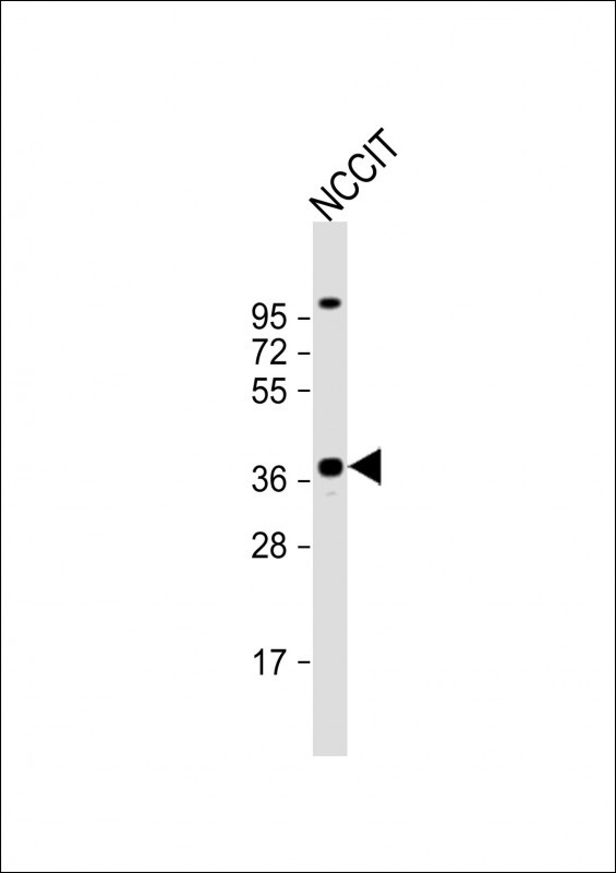 Anti-DPPA4 Antibody (N-term) at 1:2000 dilution + NCCIT whole cell lysate Lysates/proteins at 20 μg per lane. Secondary Goat Anti-Rabbit IgG, (H+L), Peroxidase conjugated at 1/10000 dilution. Predicted band size : 34 kDa Blocking/Dilution buffer: 5% NFDM/TBST.