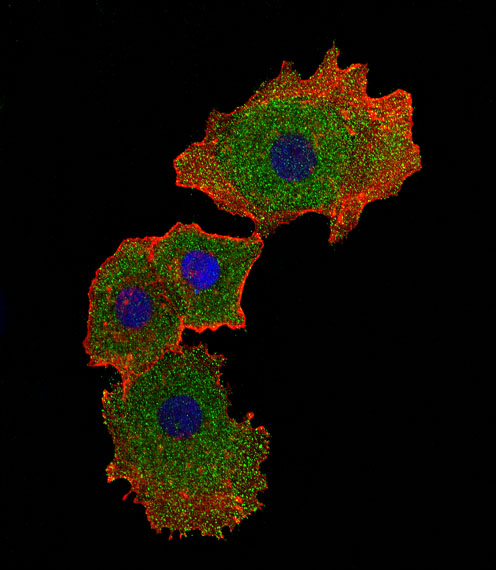 Fluorescent confocal image of MCF-7 cell stained with SMAD9 Antibody (Center)( APR10180G). MCF-7 cells were fixed with 4% PFA (20 min), permeabilized with Triton X-100 (0.1%, 10 min), then incubated with SMAD9 primary antibody (1:25, 1 h at 37℃). For secondary antibody, Alexa Fluor? 488 conjugated donkey anti-rabbit antibody (green) was used (1:400, 50 min at 37℃).Cytoplasmic actin was counterstained with Alexa Fluor? 555 (red) conjugated Phalloidin (7units/ml, 1 h at 37℃). Nuclei were counterstained with DAPI (blue) (10 μg/ml, 10 min).SMAD9 immunoreactivity is localized to cytoplasm and nucleus significantly. |