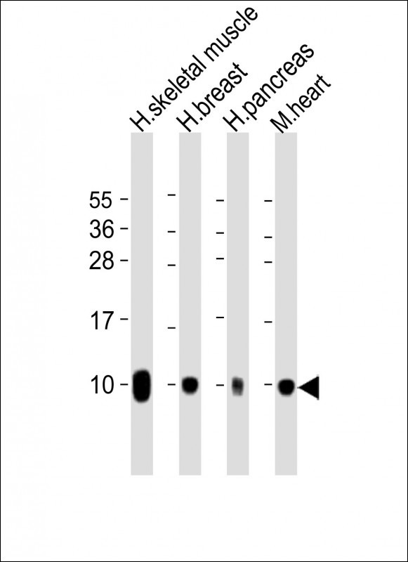 All lanes : Anti-COX7A1 Antibody (Center) at 1:2000 dilution Lane 1: human skeletal muscle lysate Lane 2: human breast lysate Lane 3: human pancreas lysate Lane 4: mouse heart lysate Lysates/proteins at 20 μg per lane. Secondary Goat Anti-Rabbit IgG, (H+L), Peroxidase conjugated at 1/10000 dilution. Predicted band size : 9 kDa Blocking/Dilution buffer: 5% NFDM/TBST. |