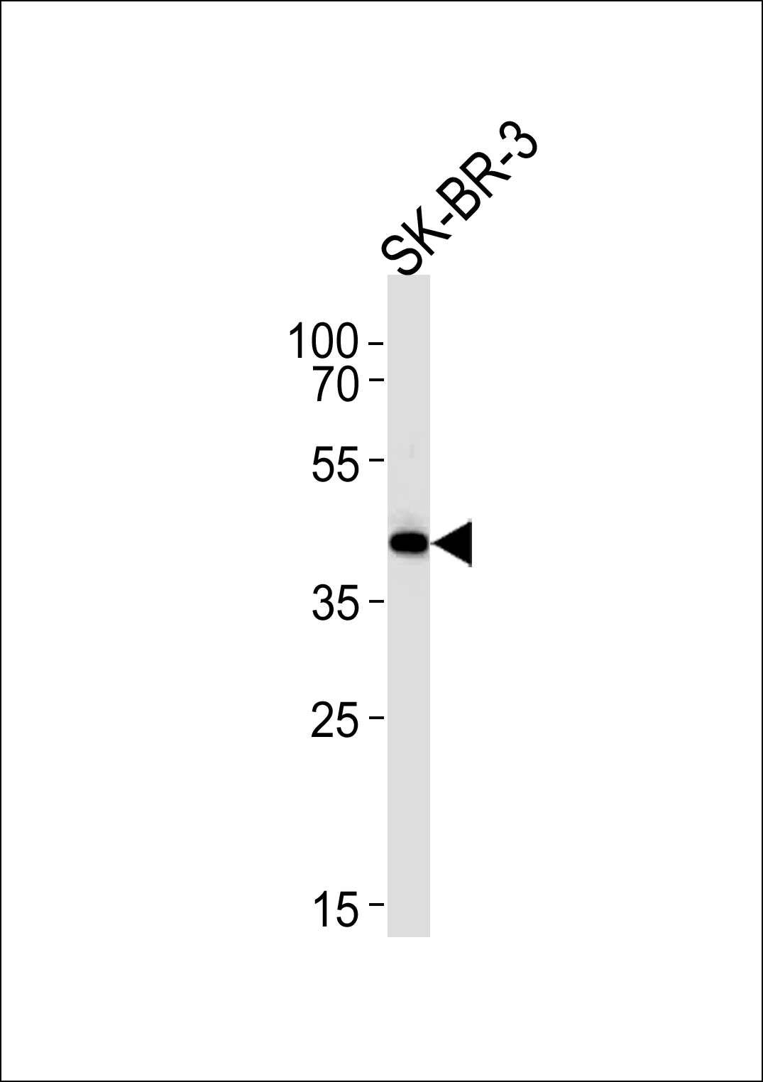 SOX8 Antibody (Center) (Cat. APR13478G) western blot analysis in SK-BR-3 cell line lysates (35ug/lane).This demonstrates the SOX8 antibody detected the SOX8 protein (arrow). |