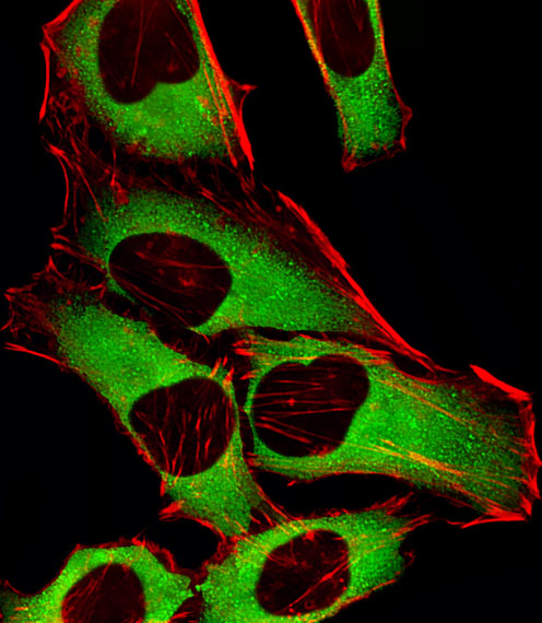 Fluorescent image of Hela cells stained with CRTAP Antibody (N-term)( APR15604G). APR15604G was diluted at 1:25 dilution. An Alexa Fluor 488-conjugated goat anti-rabbit lgG at 1:400 dilution was used as the secondary antibody (green). Cytoplasmic actin was counterstained with Alexa Fluor? 555 conjugated with Phalloidin (red).