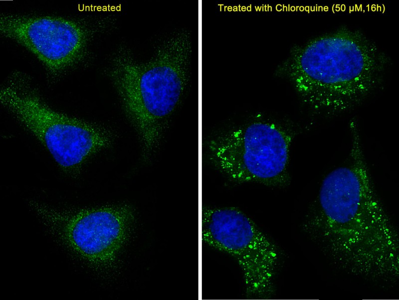 Immunofluorescent analysis of 4% paraformaldehyde-fixed, 0. 1% Triton X-100 permeabilized Hela (Human Cervical epithelial adenocarcinoma cell line) cells labeling Pdx1 with AP1805A at 1/25 dilution, followed by Alexa Fluor 488-conjugated goat anti-rabbit IgG (1583138) secondary antibody at 1/400 dilution (green). Immunofluorescence image showing vesicles staining on Hela cell line. The nuclear counter stain is DAPI (blue). The right image is Hela cells treated with Chloroquine 50μM for 16h.