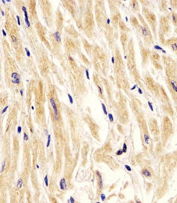 AP1805A staining Cleaved-APG8a in Human heart tissue sections by Immunohistochemistry (IHC-P - paraformaldehyde-fixed, paraffin-embedded sections). Tissue was fixed with formaldehyde and blocked with 3% BSA for 0. 5 hour at room temperature; antigen retrieval was by heat mediation with a citrate buffer (pH6). Samples were incubated with primary antibody (1/25) for 1 hours at 37°C. A undiluted biotinylated goat polyvalent antibody was used as the secondary antibody. |