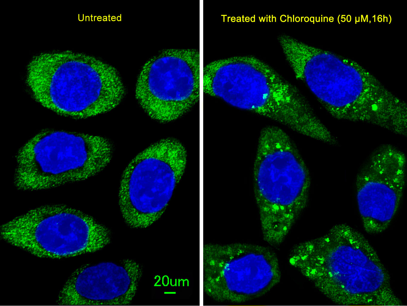Immunofluorescent analysis of U251 cells, using ATG16L Antibody(Cat. APR06988G). U251 cells(right) were treated with Chloroquine (50 μM,16h). APR06988G was diluted at 1:25 dilution. Alexa Fluor 488-conjugated goat anti-rabbit lgG at 1:400 dilution was used as the secondary antibody (green).DAPI was used to stain the cell nuclear (blue).