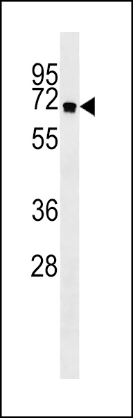 Anti-ATG16L Antibody at 1:1000 dilution + Jurkat whole cell lysate Lysates/proteins at 20 μg per lane. Secondary Goat Anti-Rabbit IgG, (H+L), Peroxidase conjugated at 1/10000 dilution. Predicted band size : 68 kDa Blocking/Dilution buffer: 5% NFDM/TBST.