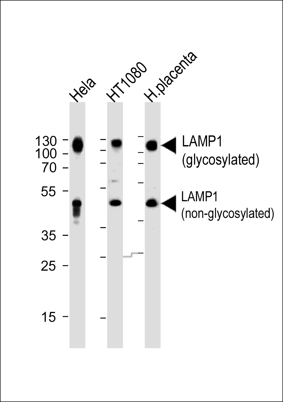 Western blot analysis of lysates from Hela,HT1080 cell line and human placenta tissue (from left to right),using LAMP1 Antibody (N-term)(Cat. APR06995G).APR06995G was diluted at 1:1000 at each lane. A goat anti-rabbit IgG H&L(HRP) at 1:5000 dilution was used as the secondary antibody.Lysates at 35ug per lane.
