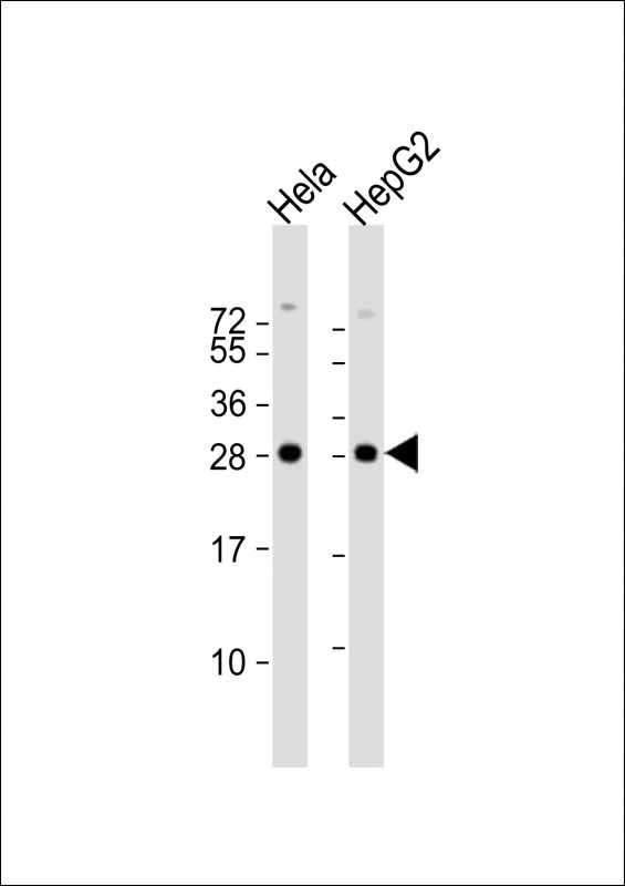 All lanes : Anti-PMM2 Antibody (C-term) at 1:1000 dilution Lane 1: Hela whole cell lysate Lane 2: HepG2 whole cell lysate Lysates/proteins at 20 μg per lane. Secondary Goat Anti-Rabbit IgG, (H+L), Peroxidase conjugated at 1/10000 dilution. Predicted band size : 28 kDa Blocking/Dilution buffer: 5% NFDM/TBST.