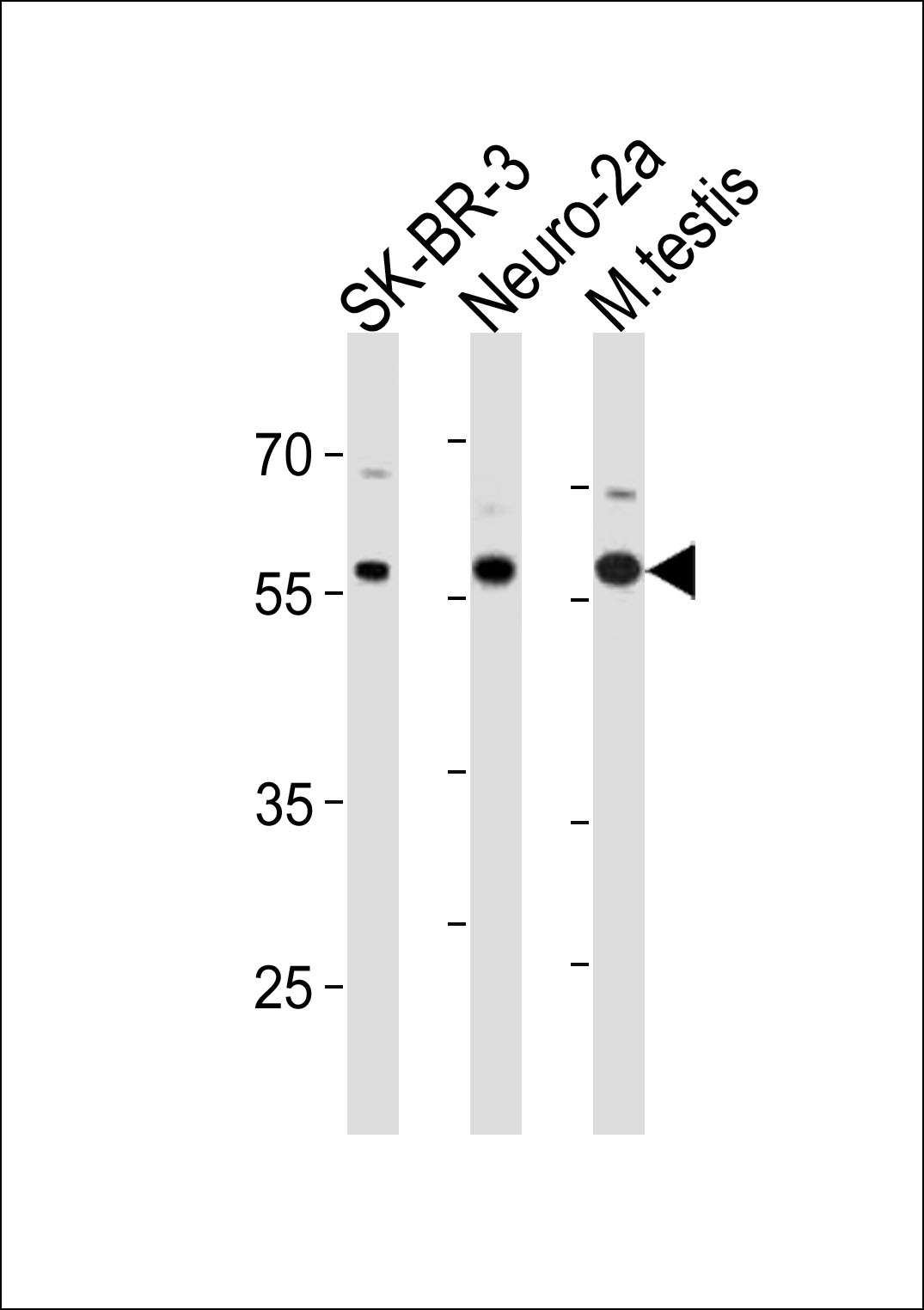 RELA Antibody (pS536) (Cat. AMR09718G) western blot analysis in SK-BR-3,mouse Neuro-2a cell line and mouse testis tissue lysates (35ug/lane).This demonstrates the RELA antibody detected the RELA protein (arrow). |