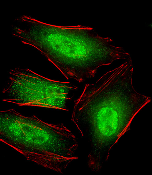 Fluorescent image of Hela cells stained with BLMH Antibody (Center)( AP20463C). AP20463C was diluted at 1:25 dilution. An Alexa Fluor 488-conjugated goat anti-rabbit lgG at 1:400 dilution was used as the secondary antibody (green). Cytoplasmic actin was counterstained with Alexa Fluor? 555 conjugated with Phalloidin (red).