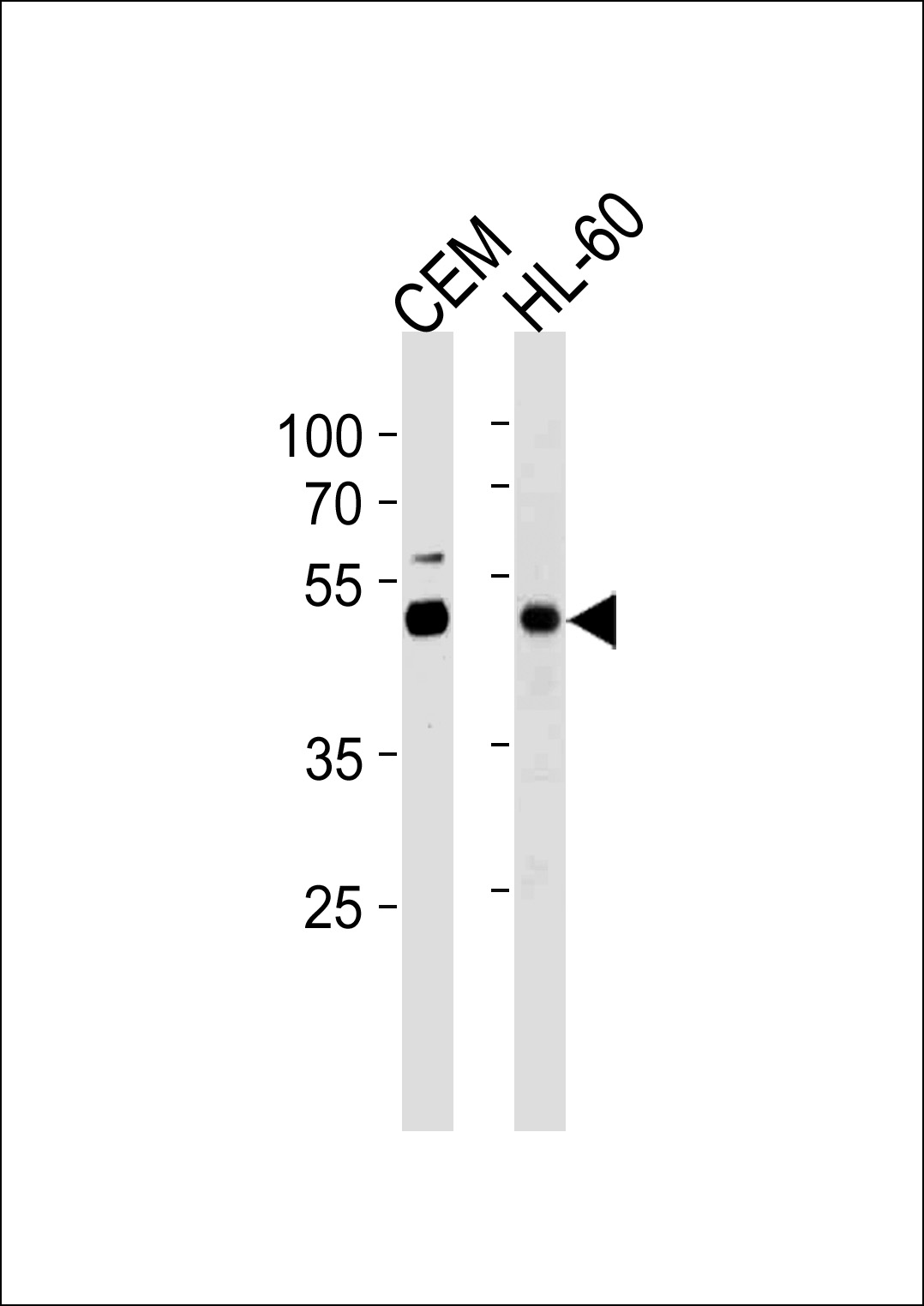 BLMH Antibody (Center) (Cat. AMM05619G) western blot analysis in CEM,HL-60 cell line lysates (35ug/lane).This demonstrates the BLMH antibody detected the BLMH protein (arrow). |