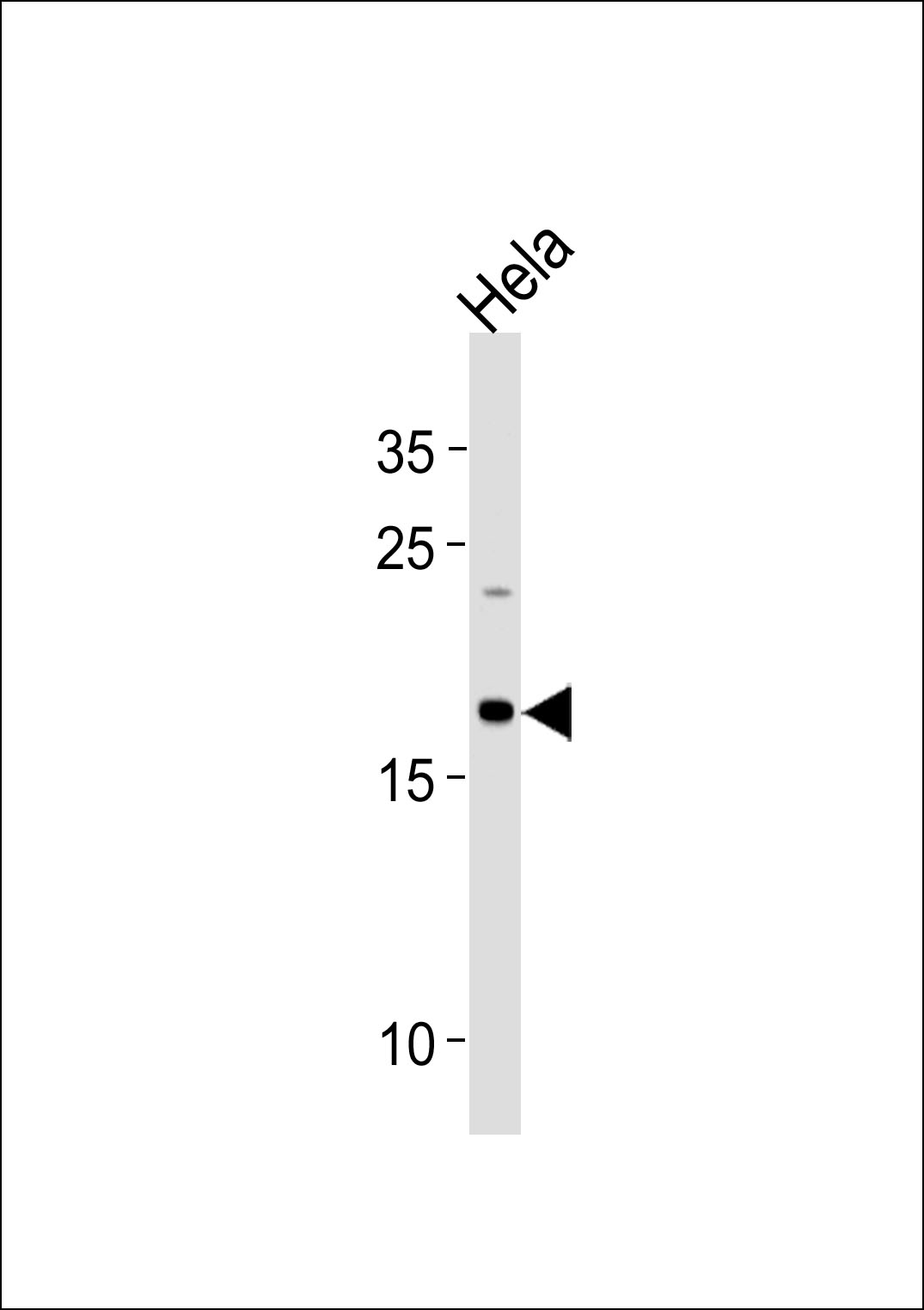 NDUFB10 Antibody (Center) (Cat. APR08662G) western blot analysis in Hela cell line lysates (35ug/lane).This demonstrates the NDUFB10 antibody detected the NDUFB10 protein (arrow). |