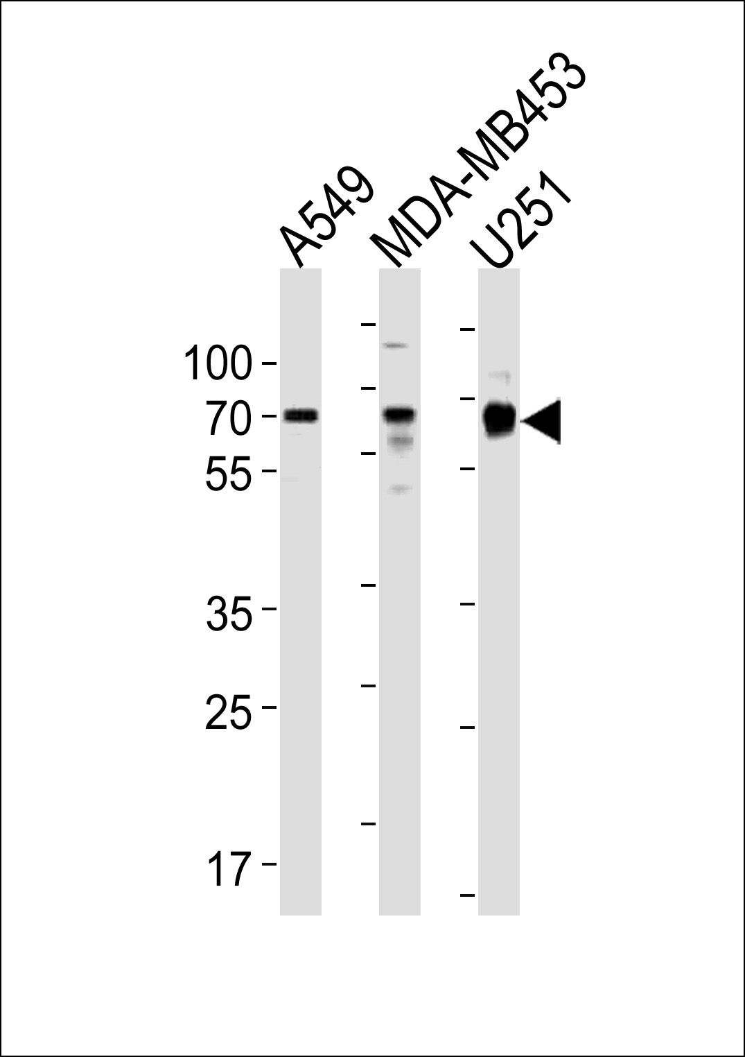 GRB10 Antibody (N-term) (Cat. APR16634G) western blot analysis in A549,MDA-MB453,U251 cell line lysates (35ug/lane).This demonstrates the GRB10 antibody detected the GRB10 protein (arrow). |