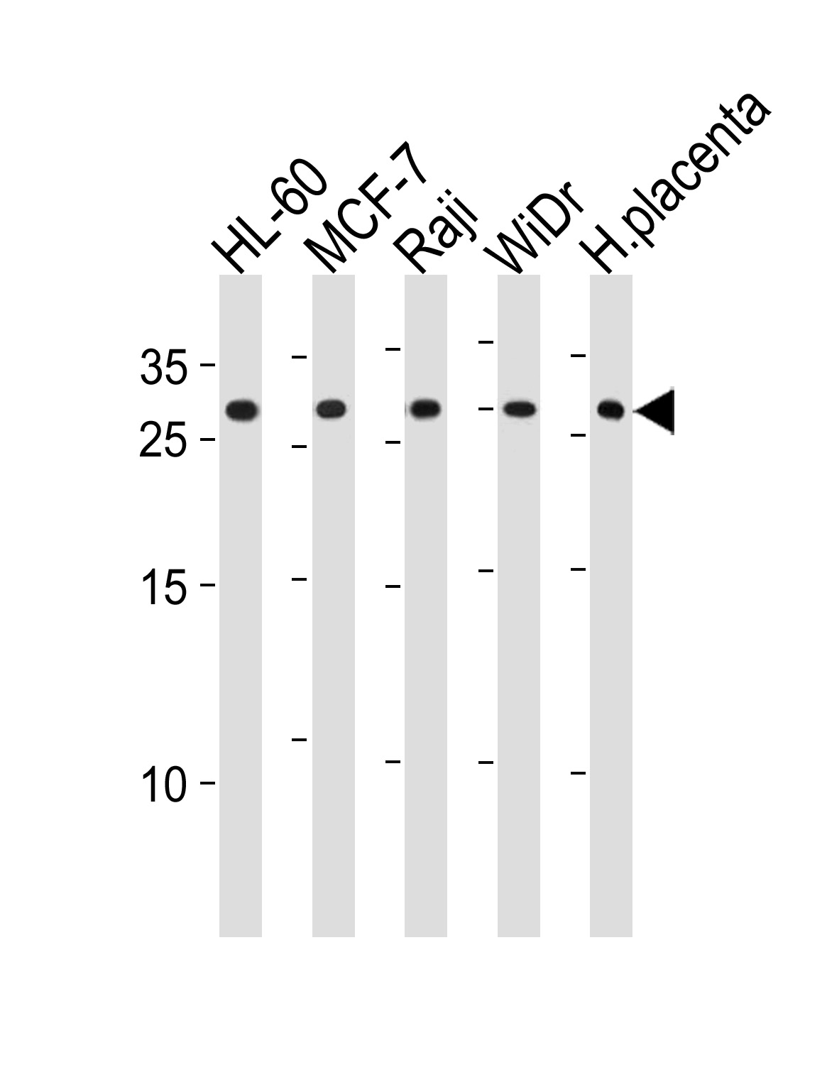 CLIC1 Antibody (Center) (Cat. APG02649G) western blot analysis in HL-60,MCF-7,Raji,WiDr cell line and human placenta tissue lysates (35ug/lane).This demonstrates the CLIC1 antibody detected the CLIC1 protein (arrow). |
