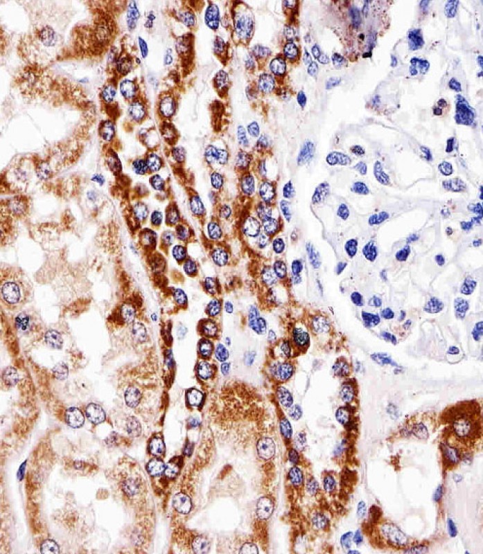 Immunohistochemical analysis of paraffin-embedded H. kidney section using NDUA4 Antibody (C-term)( AP20519B). AP20519B was diluted at 1:25 dilution. A undiluted biotinylated goat polyvalent antibody was used as the secondary, followed by DAB staining.
