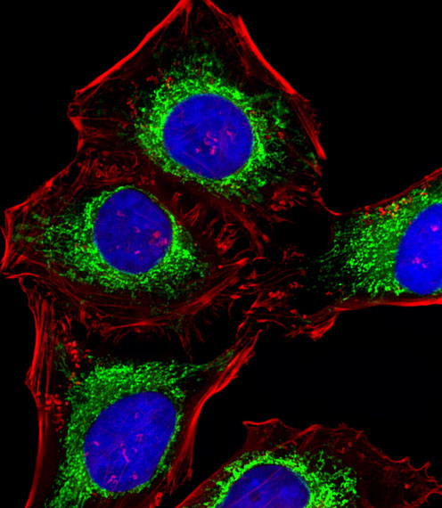 Fluorescent image of Hela cells stained with NDUA4 Antibody (C-term)( AP20519B). AP20519B was diluted at 1:25 dilution. An Alexa Fluor 488-conjugated goat anti-rabbit lgG at 1:400 dilution was used as the secondary antibody (green). DAPI was used to stain the cell nuclear (blue). Cytoplasmic actin was counterstained with Alexa Fluor? 555 conjugated with Phalloidin (red).