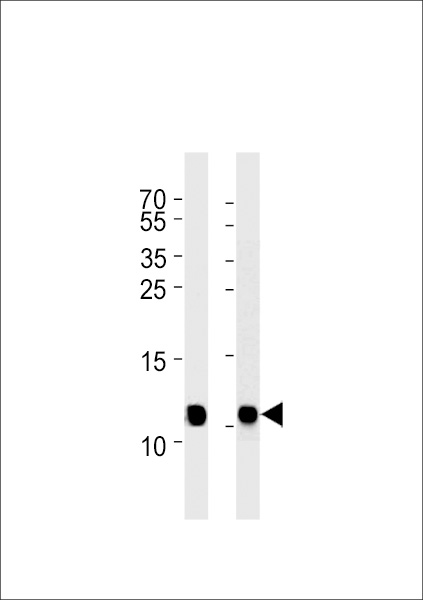 NDUA4 Antibody (C-term) (Cat. APR08636G) western blot analysis in SW480,Hela cell line lysates (35ug/lane).This demonstrates the NDUA4 antibody detected the NDUA4 protein (arrow). |