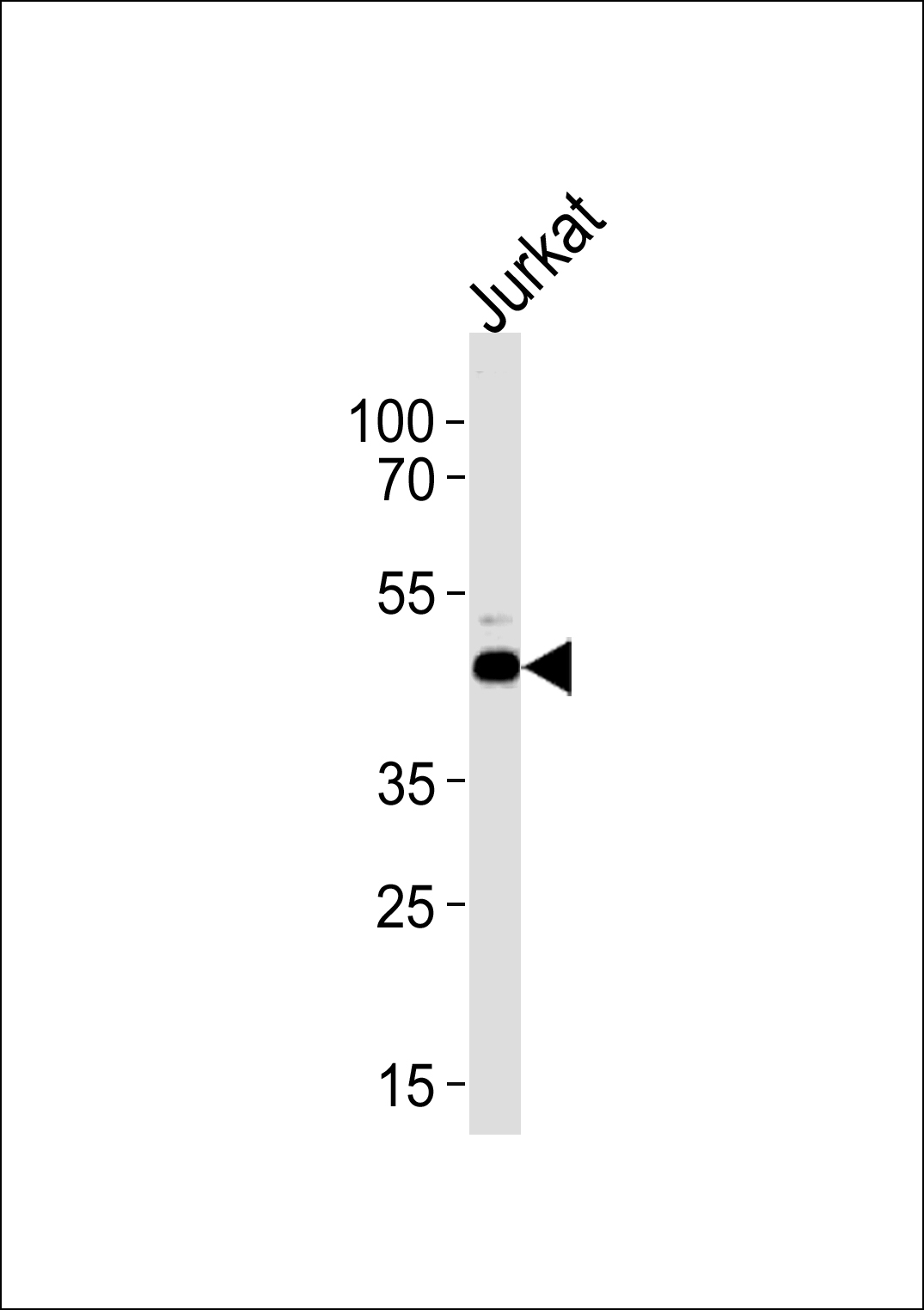 ATG4B Antibody (Center) (Cat. APG02047G) western blot analysis in Jurkat cell line lysates (35ug/lane).This demonstrates the ATG4B antibody detected the ATG4B protein (arrow). |