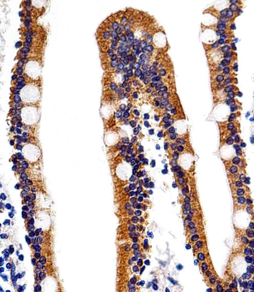 Immunohistochemical analysis of paraffin-embedded H.small intestine section using ACVRL1 Antibody (N-term)( APG01530G). APG01530G was diluted at 1:25 dilution. A peroxidase-conjugated goat anti-rabbit IgG at 1:400 dilution was used as the secondary antibody, followed by DAB staining.