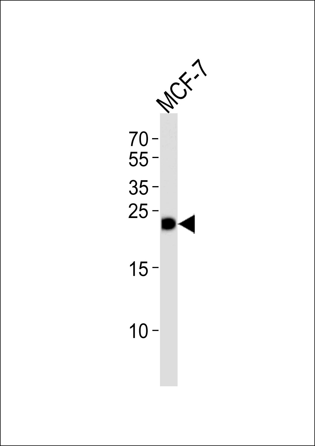 Western blot analysis of lysate from MCF-7 cell line, using GSTM4 Antibody (N-term)( AMM05253G). AMM05253G was diluted at 1:1000. A goat anti-rabbit IgG H&L(HRP) at 1:5000 dilution was used as the secondary antibody. Lysate at 35ug. |