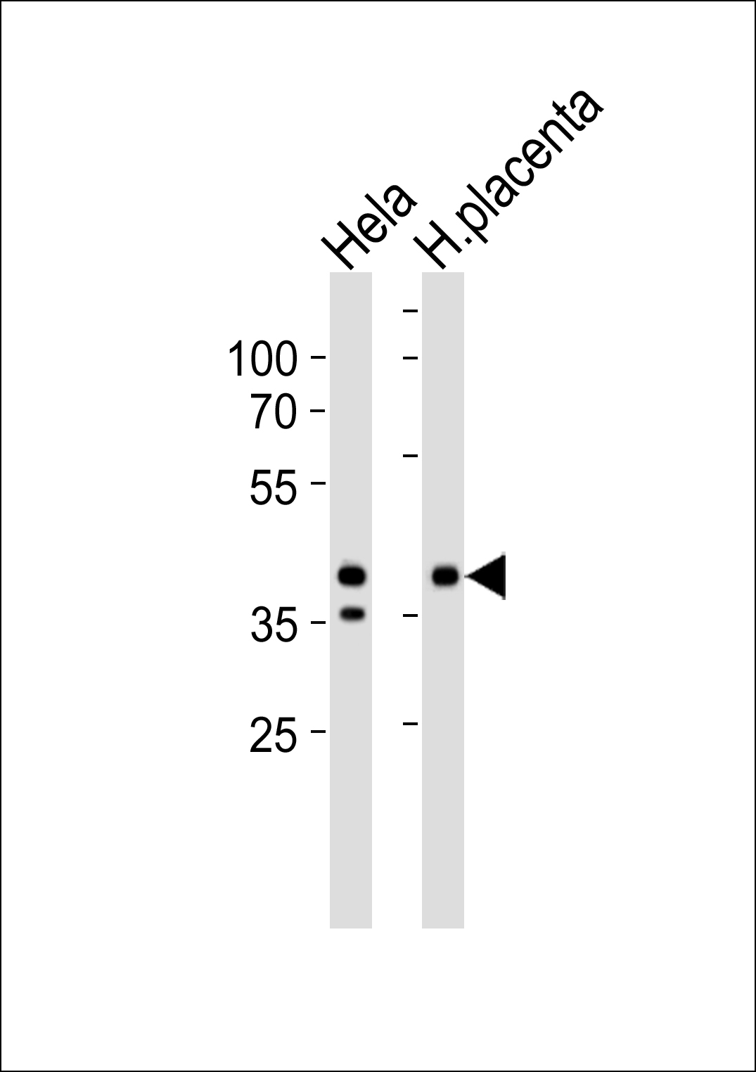 Western blot analysis of lysates from Hela cell line and human placenta tissue lysate (from left to right), using IDH3B Antibody (N-term) ( APR07935G). APR07935G was diluted at 1:1000 at each lane. A goat anti-rabbit IgG H&L(HRP) at 1:5000 dilution was used as the secondary antibody. Lysates at 35ug per lane. |