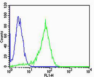 Flow cytometric analysis of Hela cells using CHML Antibody (C-term)(green, AMM05754G) compared to an isotype control of rabbit IgG(blue). AMM05754G was diluted at 1:25 dilution. An Alexa Fluor? 488 goat anti-rabbit lgG at 1:400 dilution was used as the secondary antibody.