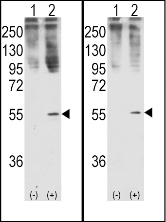 Western blot analysis of GDF11 (arrow) using rabbit polyclonal GDF11 Antibody (R47) (Cat. APR12009G).293 cell lysates (2 ug/lane) either nontransfected (Lane 1) or transiently transfected with the GDF11 gene (Lane 2) (Origene Technologies).