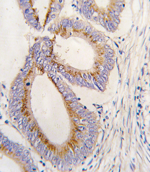 Formalin-fixed and paraffin-embedded human colon carcinoma tissue reacted with GDF11 antibody (N-term) (Cat. APR12009G), which was peroxidase-conjugated to the secondary antibody, followed by DAB staining. This data demonstrates the use of this antibody for immunohistochemistry; clinical relevance has not been evaluated. |