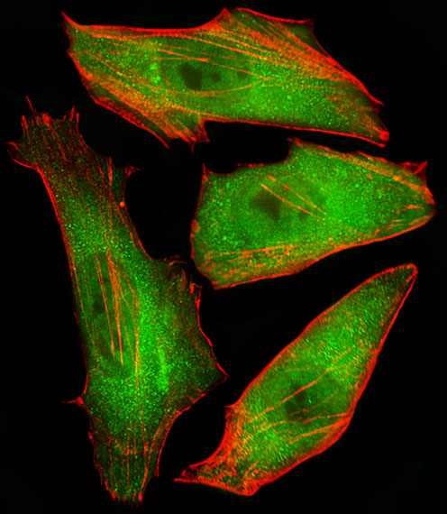 Fluorescent image of Hela cells stained with CFL2 Antibody (C-term)( APR15415G). APR15415G was diluted at 1:25 dilution. An Alexa Fluor 488-conjugated goat anti-rabbit lgG at 1:400 dilution was used as the secondary antibody (green). Cytoplasmic actin was counterstained with Alexa Fluor? 555 conjugated with Phalloidin (red).