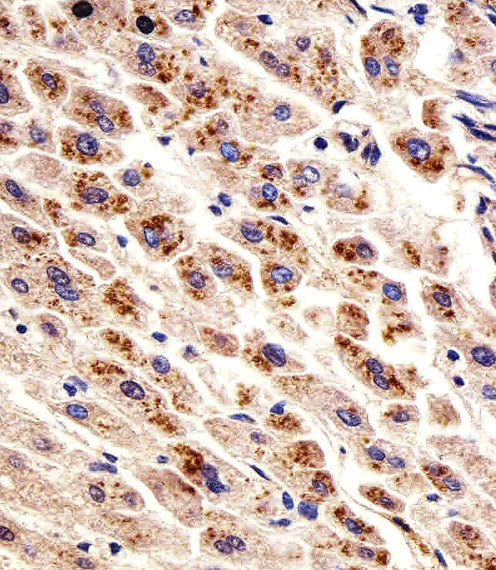Immunohistochemical analysis of paraffin-embedded H. liver section using DHFR Antibody (N-term)( APR07558G). APR07558G was diluted at 1:25 dilution. A undiluted biotinylated goat polyvalent antibody was used as the secondary, followed by DAB staining.