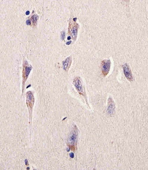 Immunohistochemical analysis of paraffin-embedded H. brain section using DHFR Antibody (N-term)( APR07558G). APR07558G was diluted at 1:25 dilution. A undiluted biotinylated goat polyvalent antibody was used as the secondary, followed by DAB staining.