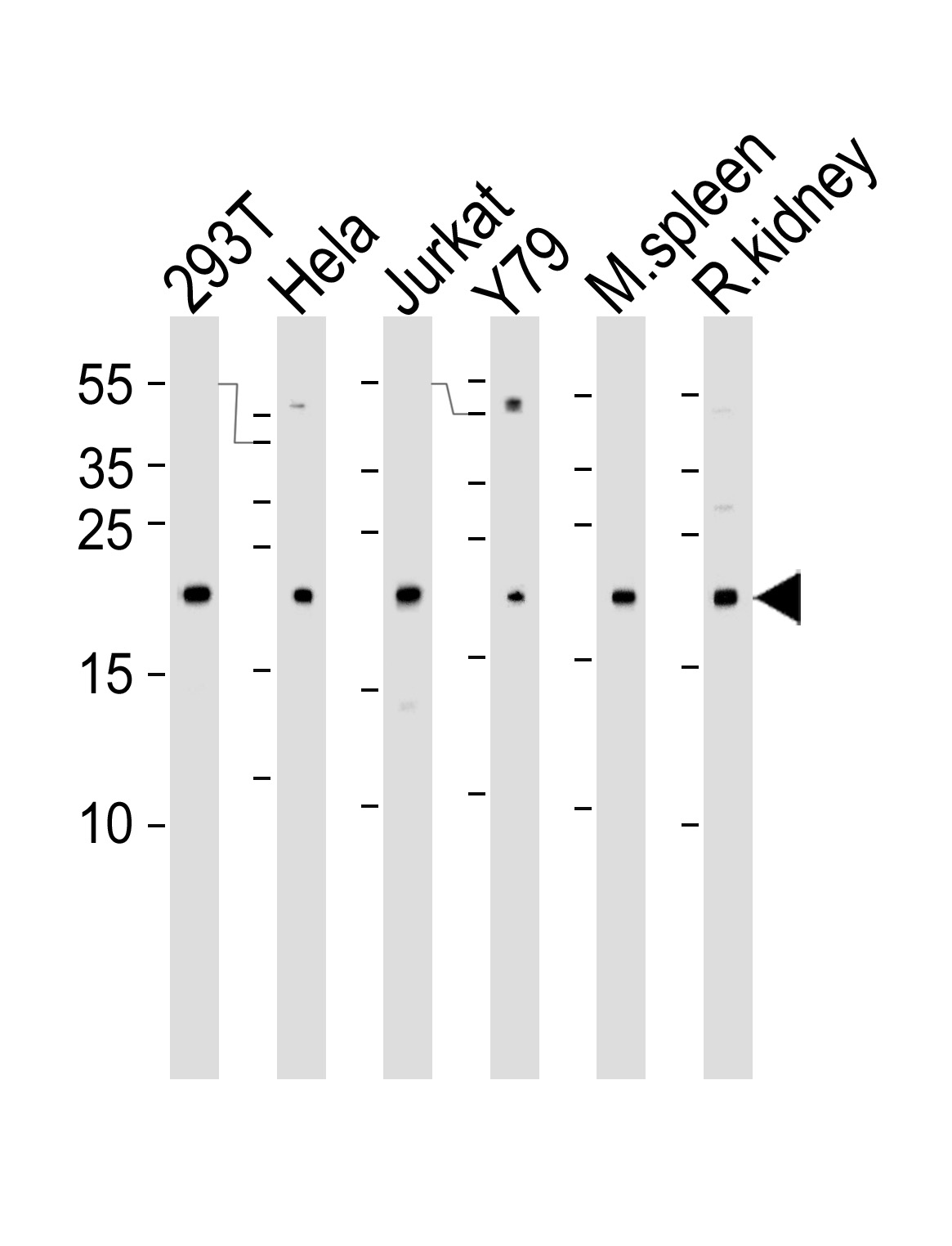 Western blot analysis of lysates from 293T, Hela, Jurkat, Y79 cell line , mouse spleen and rat kidney tissue lysate(from left to right), using DHFR Antibody (N-term)( APR07558G). APR07558G was diluted at 1:1000 at each lane. A goat anti-rabbit IgG H&L(HRP) at 1:5000 dilution was used as the secondary antibody. Lysates at 35ug per lane. |