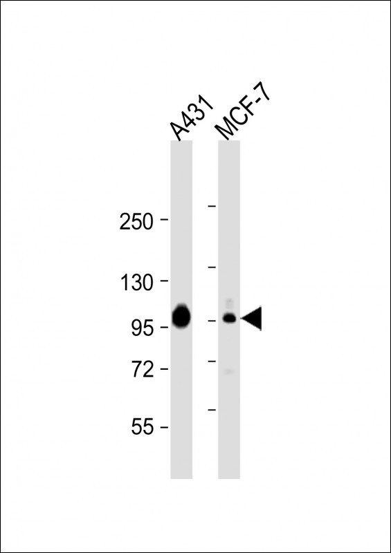 All lanes : Anti-HUMAN-CTNND1_isform 2ABC(Y174) Antibody at 1:2000 dilution Lane 1: A431 whole cell lysate Lane 2: MCF-7 whole cell lysate Lysates/proteins at 20 μg per lane. Secondary Goat Anti-Rabbit IgG, (H+L), Peroxidase conjugated at 1/10000 dilution. Predicted band size : 108 kDa Blocking/Dilution buffer: 5% NFDM/TBST.