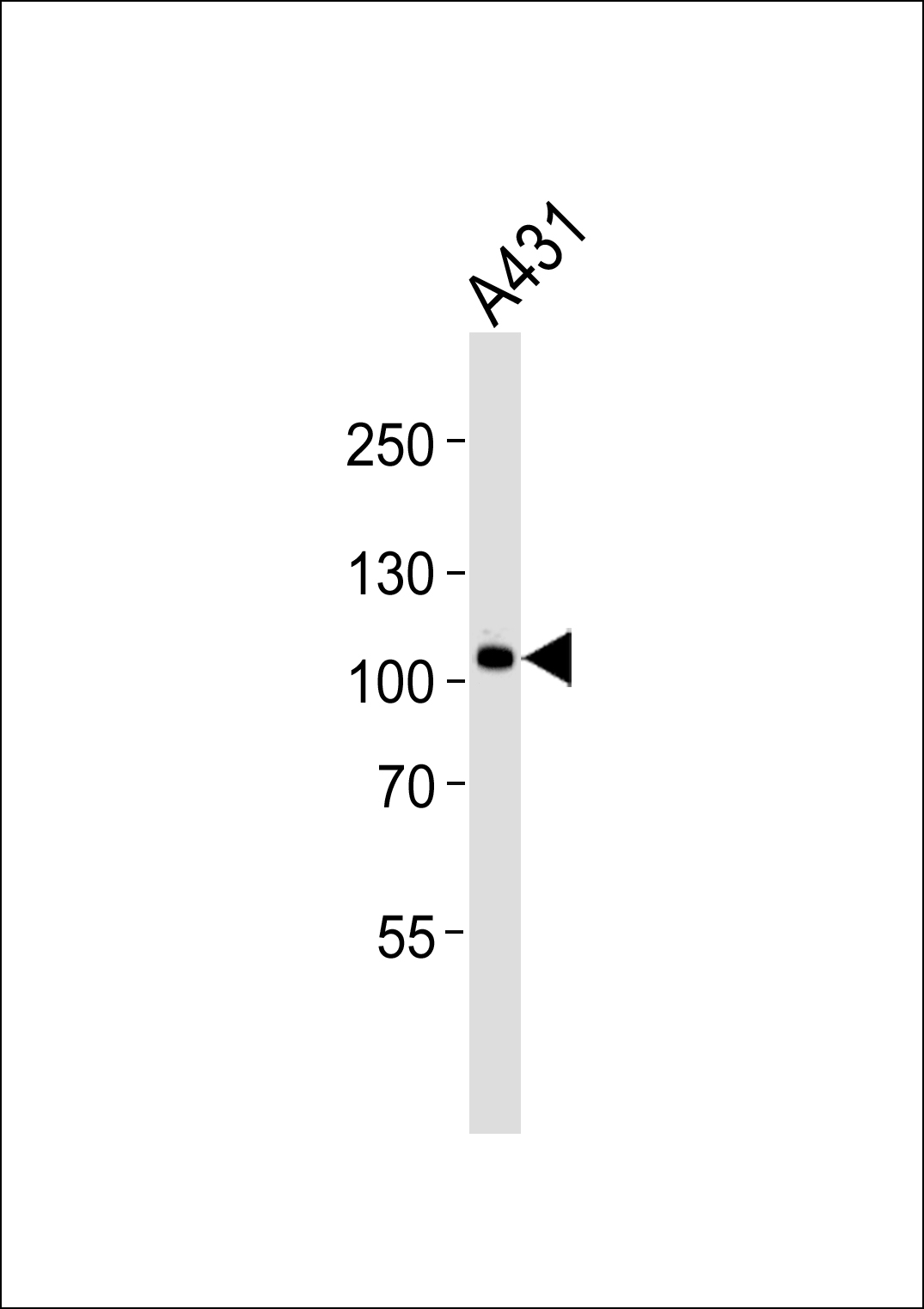 Western blot analysis of lysate from A431 cell line, using HUMAN-CTNND1_isform 2ABC(Y174) (Cat. APR16790G). APR16790G was diluted at 1:1000. A goat anti-rabbit IgG H&L(HRP) at 1:5000 dilution was used as the secondary antibody. Lysate at 35ug. |