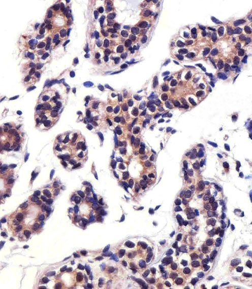 Immunohistochemical analysis of paraffin-embedded H.breast section using PTK2B Antibody (C-term)( AMR09636G). AMR09636G was diluted at 1:25 dilution. A peroxidase-conjugated goat anti-rabbit IgG at 1:400 dilution was used as the secondary antibody, followed by DAB staining.